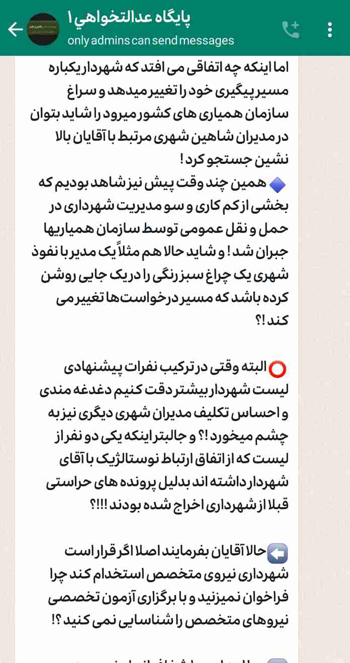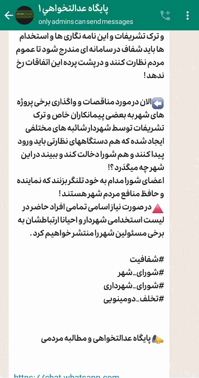 در ذیل مطالب درج شده توسط پایگاه عدالتخواهی و مطالبه مردمی شاهین شهر در کانال واتساپی آن و فضای مجازی را به اطلاع شهروندان فهیم و شریف شاهین شهر می‌رسد: