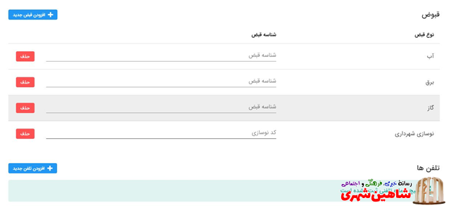 در مرحله بعد بایست اطلاعات قبوض خدمات شهری ملک (آب، برق و گاز) را وارد نمایید. این اطلاعات را میتوانید از قبض صادره شرکتهای برق، آب و گاز استخراج نمایید و نیازی نیست که حتما قبض به نام مالک باشد و در صورتی که بنام مالک یا مستاجر جهت ارسال قبوض ثبت شده باشد از روی اطلاعات پیامک های شرکت های مربوطه گاز برق یا آب قایبل استخراج می باشد. در صورتی که ملک شما بیش از یک قبض دارد یا اطلاعات یکی از قبوض نمایش داده نمیشود، گزینه افزودن قبض جدید را انتخاب نمایید.