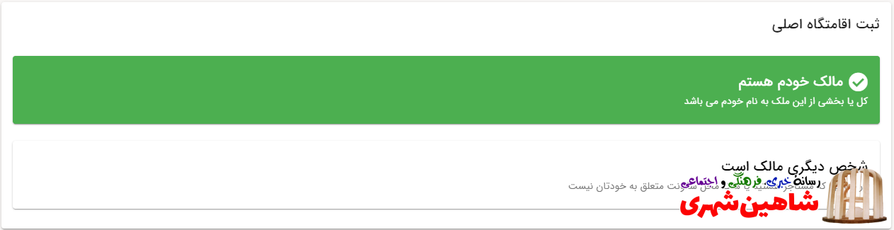 ابتدا لازم است انتخاب نمایید که مالک اقامتگاه اصلی خود هستید یا شخص یا سازمان دیگری مالک است.