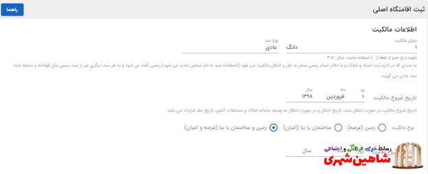 با انتخاب گزینه افزودن اقامتگاه، در صورتی که مالک تمام یا بخشی از ملک باشید در این صفحه اطلاعات خواسته شده را وارد نمایید. دقت کنید میزان مالکیت نمیتواند بیشتر از ۶ دانگ باشد. همچنین منظور از عرصه همان زمین و منظور از اعیان همان ساختمان میباشد. به عنوان مثال اگر گزینه «اعیان» را انتخاب کنید صرفا مالک ساختمان شناخته میشوید. همچنین انتخاب گزینه «عرصه و اعیان» یعنی هم زمین و هم ساختمان در مالکیت شما قرار دارد: