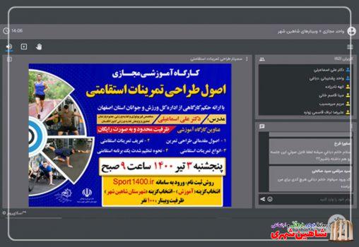 به همت سازمان فرهنگی اجتماعی ورزشی شهرداری شاهین شهر و اداره ورزش و جوانان شهرستان شاهین شهر و میمه کارگاه آموزش مجازی اصول طراحی تمرینات استقامتی برگزار شد.